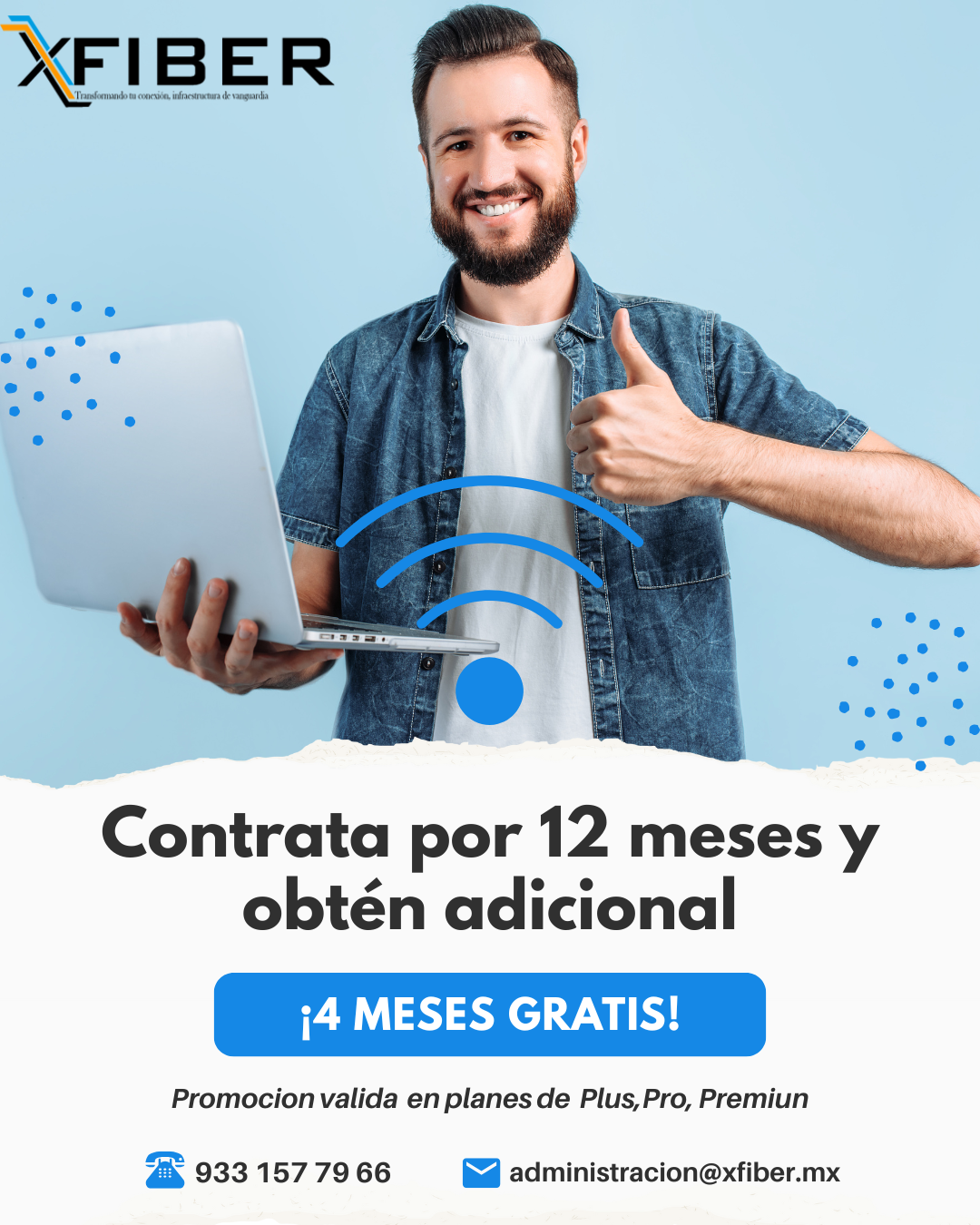 ¿Listo para experimentar la velocidad y estabilidad de XFIBER.mx? Contrata nuestro servicio por 16 meses y ¡te regalamos 4 meses de internet sin costo! Es la oportunidad perfecta para que tú y tu familia disfruten de la mejor conexión sin preocupaciones.